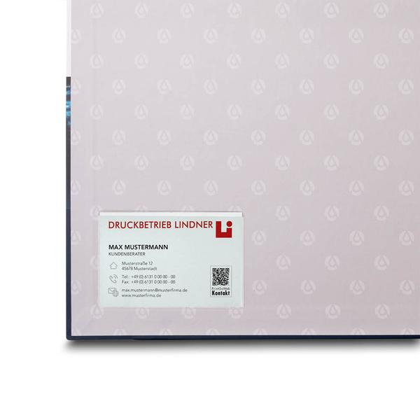 Der Installationsordner AQUAFIDES ist eine hochwertige, stabile Präsentationslösung für die Wasserhygiene-Branche. Gefertigt auf 1,9 mm starker Graupappe und außen wie innen mit laminiertem Papier bezogen, überzeugt er durch eine matte, kratzfeste Cellophanierung und eine präzise Verarbeitung. Mit 36 mm Rückenbreite, einer 4-Ring-Combi-Mechanik mit 20 mm Füllhöhe für rund 150 Blatt sowie transparenter Visitenkartentasche bietet er eine durchdachte und langlebige Ausstattung. Die Titelseite ist mit Logo und passendem Aqua-Design auf 150 g Bilderdruck matt bedruckt und transportiert die Markenbotschaft klar und professionell. Die AQUAFIDES GmbH bündelt in diesem Ordner Prüfberichte, Anlageninformationen und Serviceunterlagen übersichtlich und präsentiert ihre technischen Leistungen klar beim Kunden vor Ort. Als Hersteller besonderer Präsentationsordner unterstützen wir dabei, diese Inhalte in einem hochwertigen Markenauftritt sichtbar und überzeugend darzustellen.