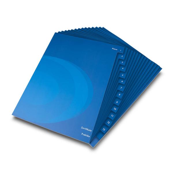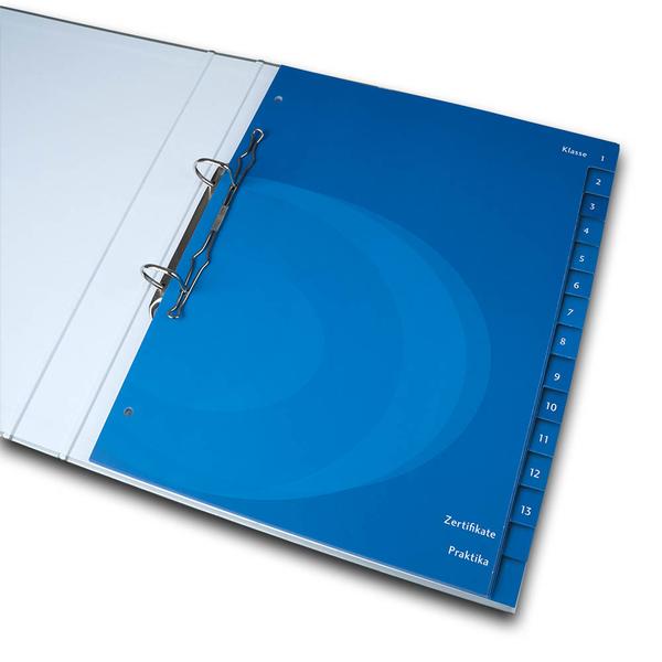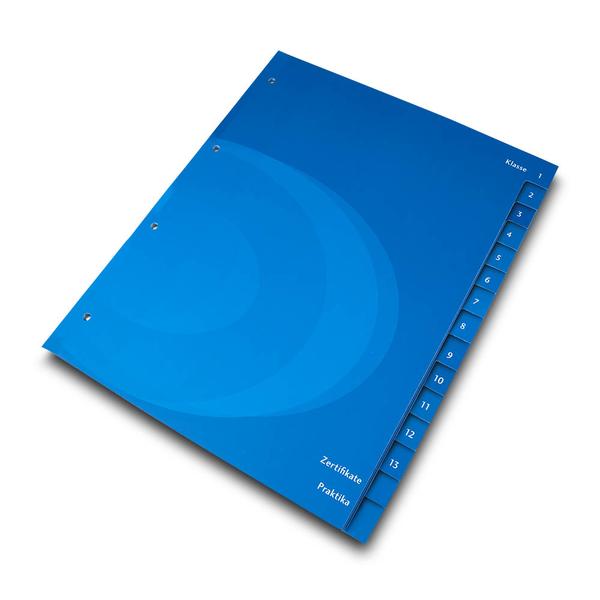 Das Register für die Europa-Schule ist ein robustes, einseitig blau bedrucktes Organisationsmittel mit einseitiger matter Cellophanierung, das Unterlagen im Schulalltag klar und dauerhaft strukturiert. Die 15 Registertaben sind logisch aufgebaut: Klassenstufen 1 bis 13 sowie zwei zusätzliche Trennbereiche für Zertifikate und Praktika, sodass alles schnell wiedergefunden wird. Eine stabile 4-fach Lochung sorgt für sicheren Halt im Ordner und macht das Register ideal für die tägliche Nutzung im Unterricht. Wir von firmenordner.de unterstützen die Obermayr Europa-Schulen dabei, ihren pädagogischen Anspruch im Bildungssektor sichtbar zu machen und Ordnung als festen Bestandteil des Lernens zu fördern. Das Register stärkt den Markenkern der Schule – Struktur, Verlässlichkeit und Qualität – und vermittelt Schülern sowie Eltern eine professionelle, gut organisierte Arbeitsweise.
